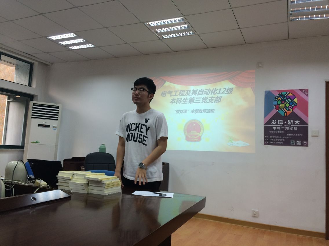 6月4日晚,电气学院电气12级本科生第三党支部党员教育“微党课”活动在电机工程楼201会议室举行,会议由支部书记孙翀主持。本次活动作为党支部“两学一做”学习教育活动的重要部分,旨在激发党员学习热情,提升党员素养。支部荣幸邀请到了李济沅学长和李业鑫同学两位优秀党员代表带领支部成员开展微党课学习,除了支部成员之外,本次“微党课”活动还吸引了电自4,5班的许多非党员同学参与。