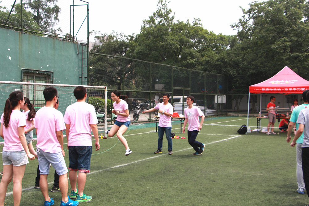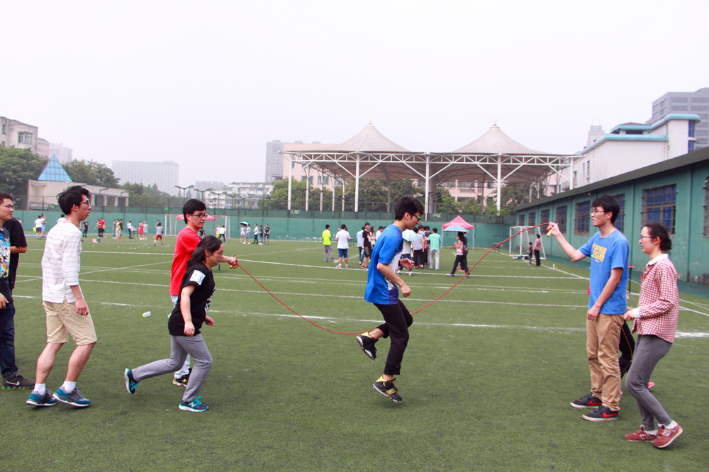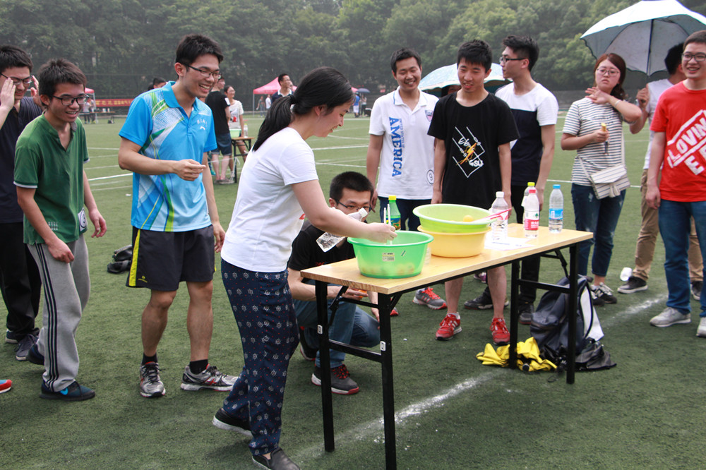 在大家都明确了规则后比赛正式开始。本届趣味运动会一共有十二支队伍参加,项目一共六个,包括跳大绳、筷子夹乒乓球、沙包入筐、障碍接力跑、绑腿赛跑和袋鼠跳接力。每个项目都要求团队一起配合,又具有很高的技巧性。但在参赛者的眼中,完成这些项目都是轻而易举。跳大绳场地内大家身轻如燕,面对上下翻飞的长绳,起跳过绳一气呵成;绑腿赛跑那边队员们齐头并进,绑腿的横幅完全没有对行动产生约束,彼此默契得仿佛同一个人的肢体;在沙包入筐的比赛现场,尽管队员是背对筐抛掷,但被掷出的沙包仿佛安装了制导系统,接沙包的队员轻舒手臂便将一个个沙包纳入筐中;筷子夹乒乓球处大家夹的技术实在了得,三两下便提筷带球出发,然后飞奔数秒将球稳稳地放在终点的盆中;障碍接力跑与袋鼠跳接力的参赛队员们也充分地展现了自己的速度、灵活与协调,纷纷很快完成了项目。尽管空中骄阳似火,大家的热情却丝毫不减,欢呼声在赛场的各个角落此起彼伏。趣味运动会的所有比赛项目告一段落后,在场地中央又举行了趣味吃西瓜比赛,拼搏了一下午大家早已口干舌燥,纷纷大口吃着西瓜,享受着这来之不易的甘甜和清凉。
