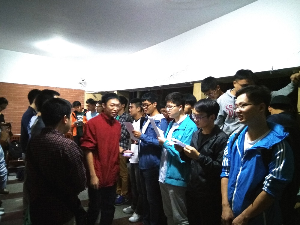 唯有简单的钢琴伴奏,也省去华丽的舞台灯光,再加上两个班的数十名新生,在班长卢春宏、徐乃珺和文艺委员陈乾、指挥林申力和钢琴伴奏王子璇的带领下,反复练习着《浙江大学校歌》和自选曲目《长江之歌》。校歌辞藻华丽,歌词全由文言文四字短语组成,引经据典丰富,读起来也比较拗口,加上很多同学本科就读于其他学校,此前并不会唱。来自浙江大学文琴艺术团的林申力学长亲自上阵,一词一句耐心教唱,一丝不苟认真教学,将专业问题通俗化简单化,力求每一位同学都能理解,及时指出合唱中存在的问题。几轮下来后,大家逐渐熟悉了两首歌的旋律,于是两班班长决定将所有人分成几个声部,实行各声部独立练习。其中陈乾、罗烨锋、徐乃珺同学更是自告奋勇,发挥自己音乐特长,指导部分困难同学,耐心帮他们校正音准,找准节奏。在这之后同学们又进行了自选曲目《长江之歌》的排练,雄浑激昂的钢琴伴奏加上大家似火的热情,一条歌声组成的“长江”开始在教室中翻滚涌动,一直淌入每个人的心尖。