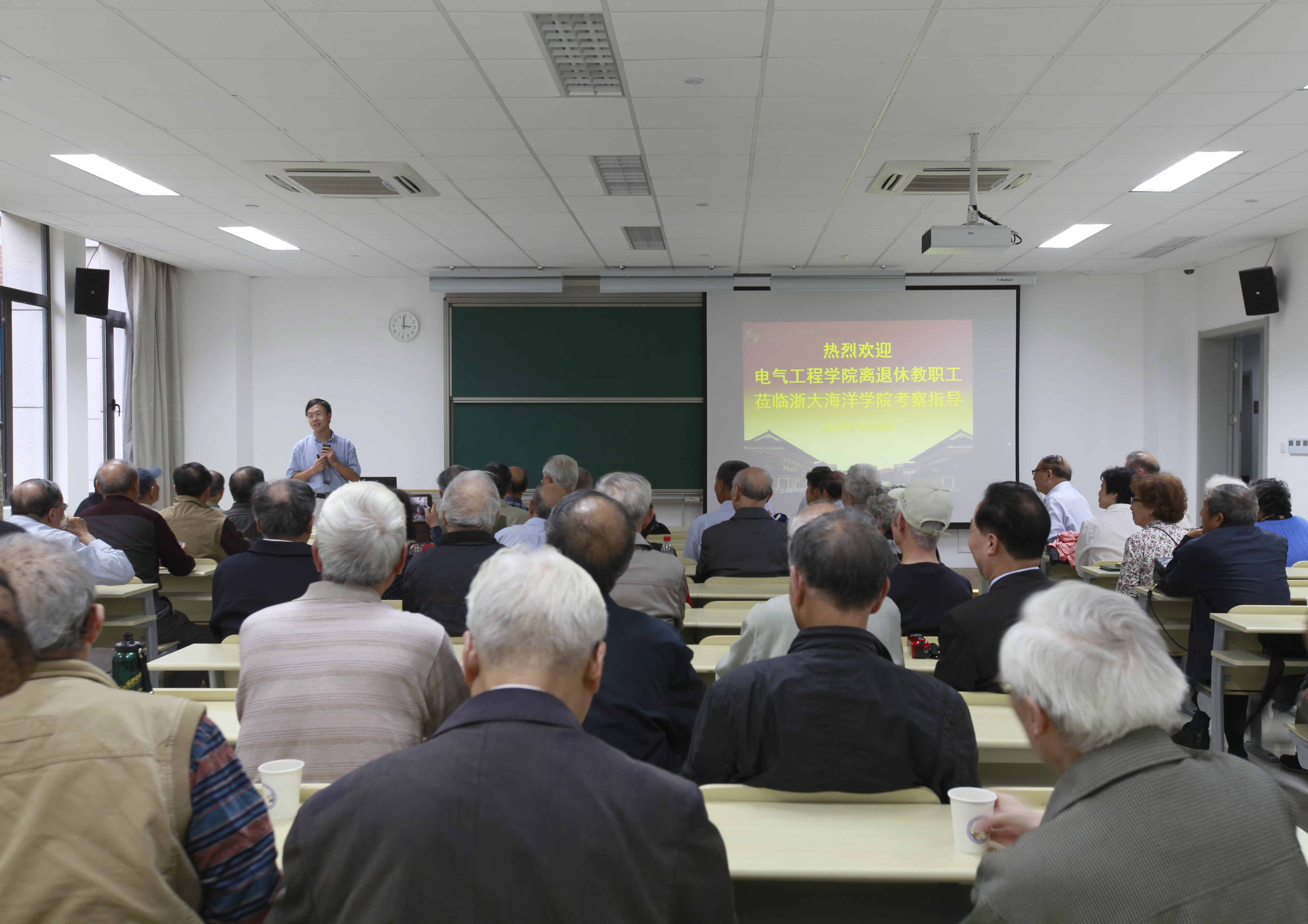 在舟山校区教学楼,浙江大学校长助理、海洋学院院长陈鹰教授热情仔细地介绍了校区的筹备、建设情况,通过他的介绍,离退休教师体会到了中央及省、地区领导对舟山校区和海洋学院建设的重视和支持,了解了学校领导和学院职工为舟山校区和海洋学院建设做出的努力。陈鹰院长随后重点介绍了海洋学院的学科设置和建设,我校在舟山这个海岛上建设海洋学院的战略意义以及该学科的建立对提高学校总体水平的贡献等,并描绘了今后几期发展的建设计划。此外陈鹰院长还热情生动地介绍了在这里工作和生活的情况。