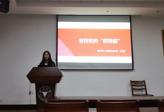 沈莉娟同学的微党课主题是“老百姓的获得感”,通过网络热门词汇“获得感”切入主题,深入分析了现今社会中基层老百姓拥有的获得感和期许的获得感;剖析了医患纠纷、医疗改革,高考制度变革等当下热门的话题,最后结合浙大精神谈到了浙大学子所有的获得感,层层深入的微党课内容让支部成员们有所得、有所思。