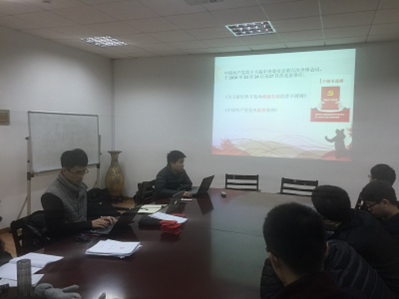 在预备党员转正环节结束之后,支部委员江海天同学为大家梳理了一下关于十八届六中全会的重要内容。从全面从严治党、严肃党内政治生活、完善党内监督和迎接十九大这几个方面进行介绍,联系了“四个全面”“三严三实”“四讲四有”等相关知识让在场同学对于十八届六中全会有了更为深入全面的认识。