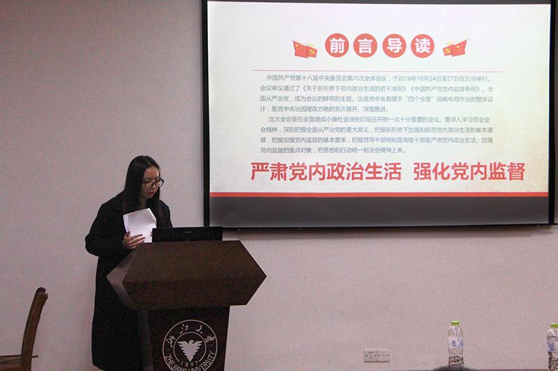 本次学习会主要围绕是八届六中全会精神,尤其是“全面从严治党”这一主题。学习的重点有三:党的十八届六中全会主要内容、严肃党内政治生活和强化党内监督。