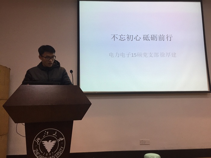 首先,徐厚健同志的主题围绕“不忘初心,砥砺前行”,以自身经历为引,历史人物刘璋的事迹为例,讲述了“以人为本”的初心。而今,徐厚健同志提到,作为学生党员,应该坚守科研初心、职业规划的初心、做人的初心。“十年磨一剑,始终坚持自己的初心,出鞘的绝对是绝世好剑。”