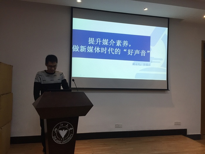 谷恭山同志就“提升媒介素养”的话题进行探讨,分别讲解了对媒介素养现状的认识,以及作为学生党员应该如何成为新媒体时代的“好声音”。谷恭山同学就当下很受关注的“罗一笑事件”进行分析,指出学生党员应该有明辨网络信息真伪的能力,应该成为“党的政策的传播者、时代风云的记录者、社会进步的推动者与公平正义的守望者。”