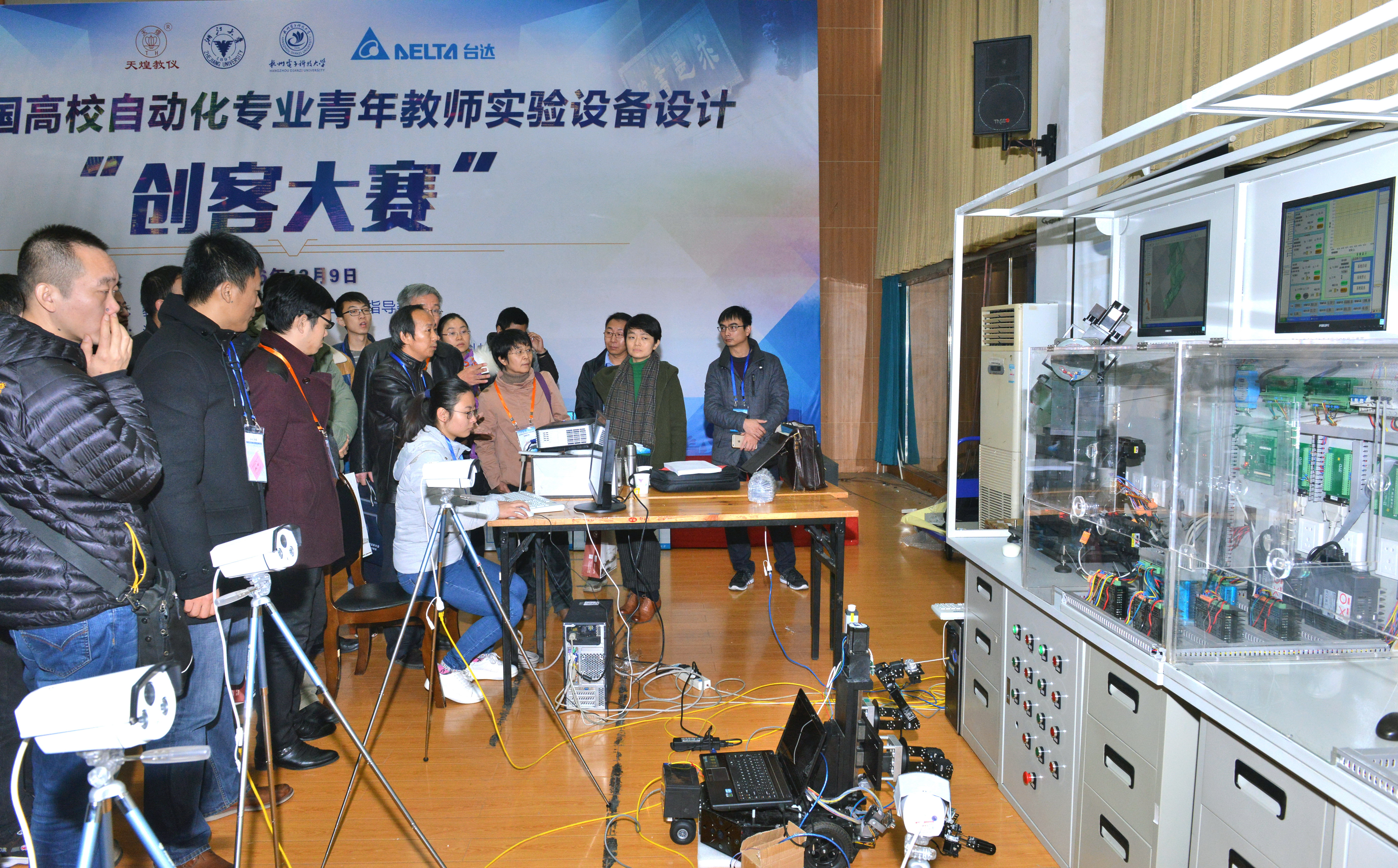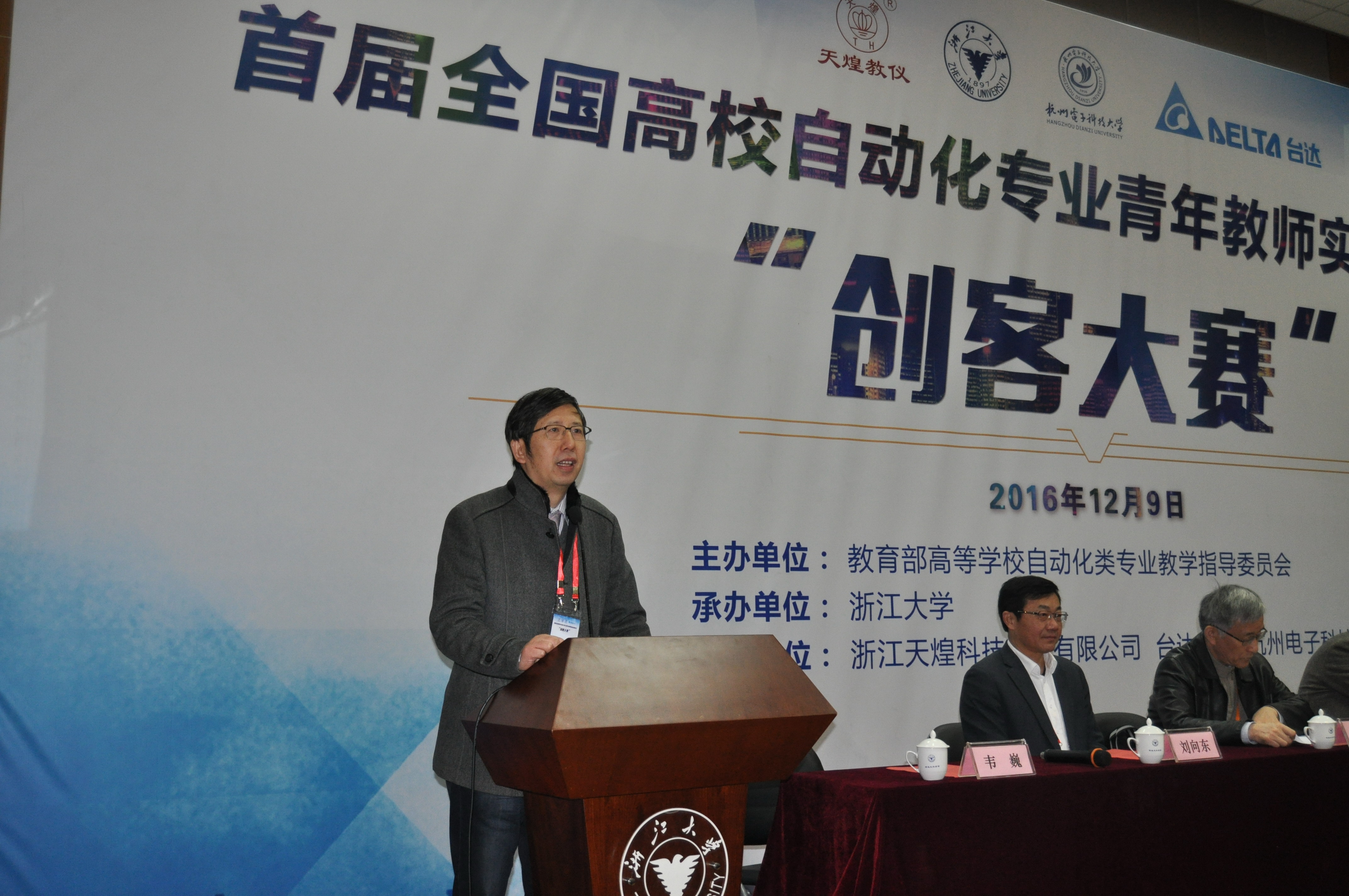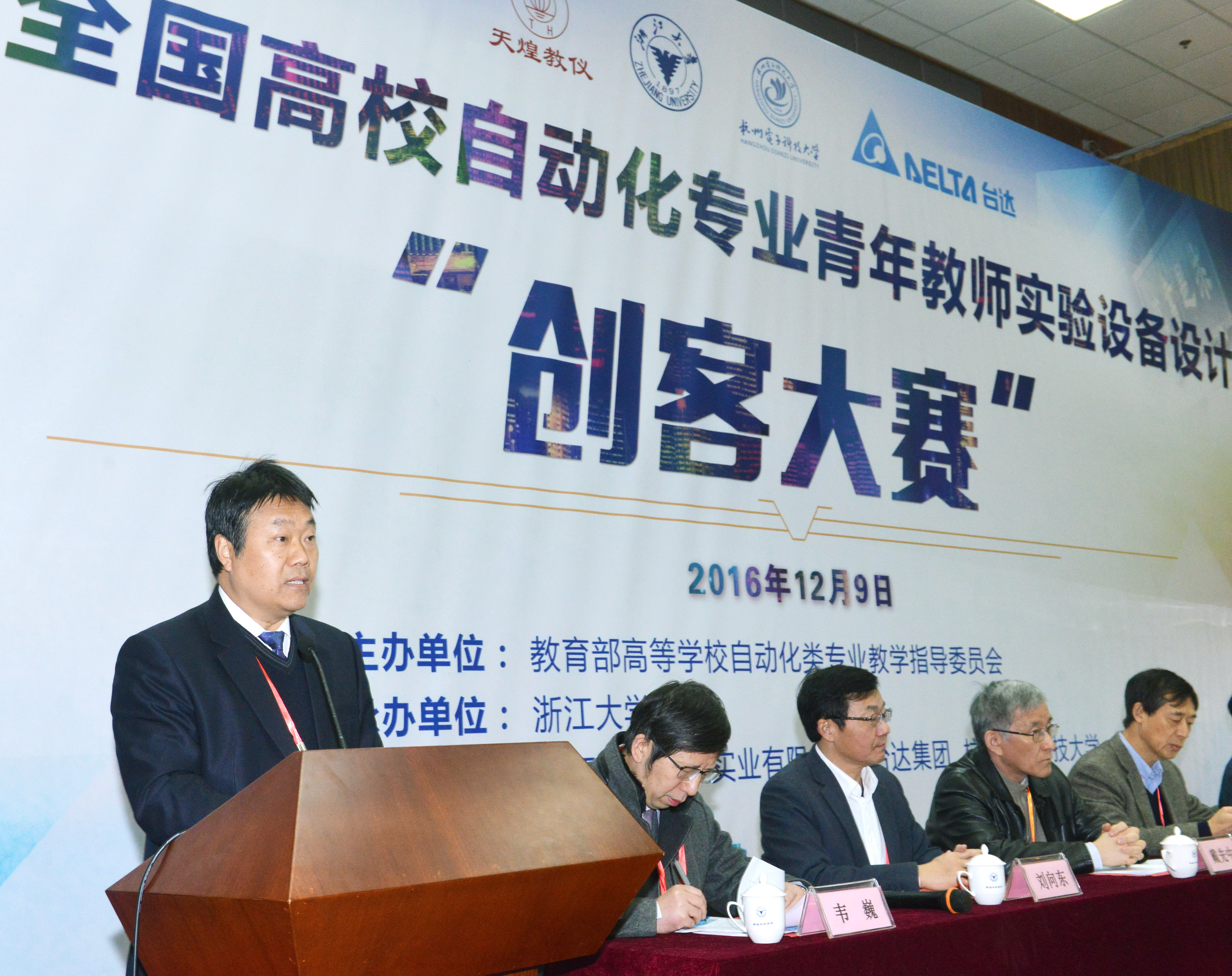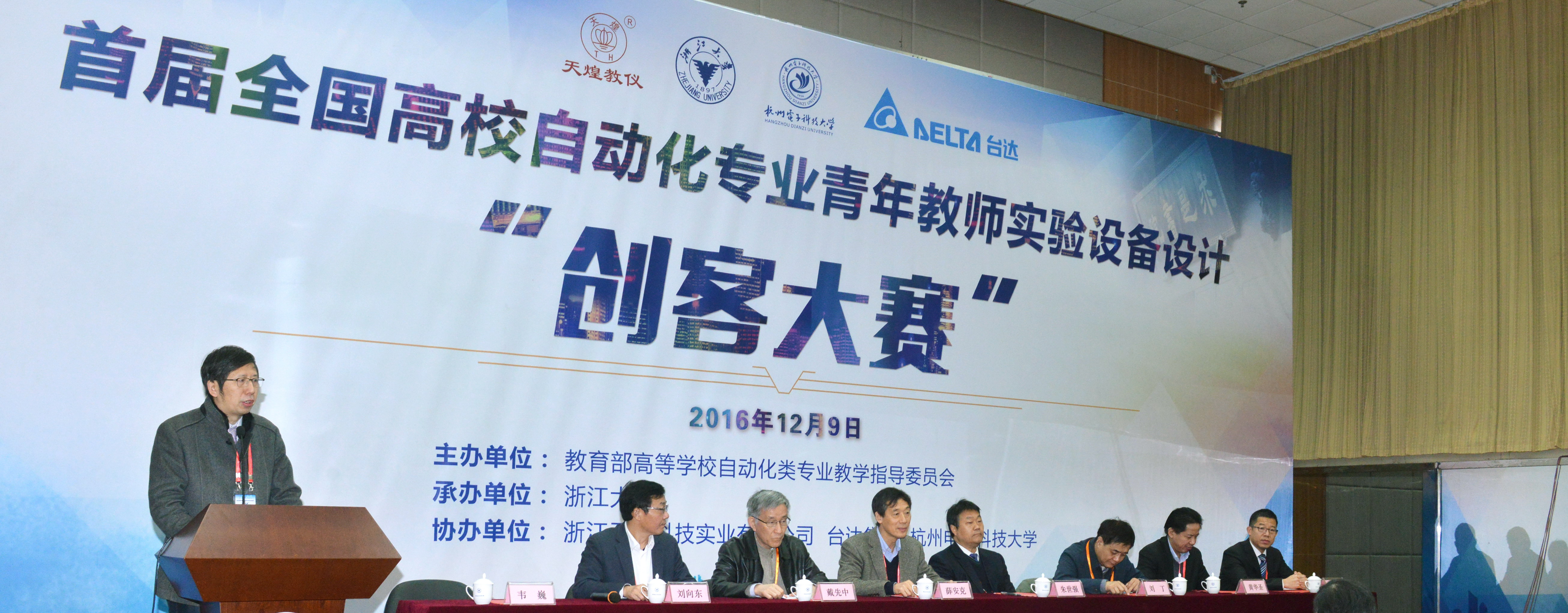2016年12月10日至11日,首届全国高校自动化专业青年教师实验设备设计“创客大赛”在浙江大学举行。浙江大学党委副书记朱世强,杭州电子科技大学校长薛安克,教育部高校自动化类专业教指委副主任委员刘丁、戴先中,委员齐晓慧、俞立、王红等,中国自动化学会教育工委副主任委员孙跃,浙江大学刘向东、张光新、马皓,杭州电子科技大学彭冬亮以及大赛赞助单位浙江天煌科技实业有限公司黄华圣、台达集团王乃全等参加了开幕式。开幕式由浙江大学电气工程学院院长韦巍主持。