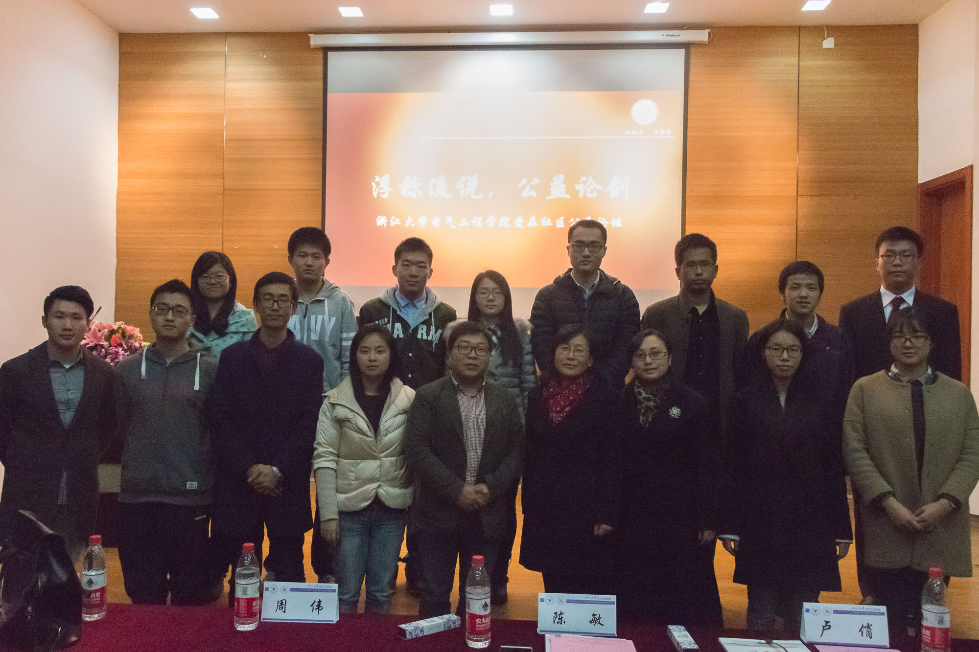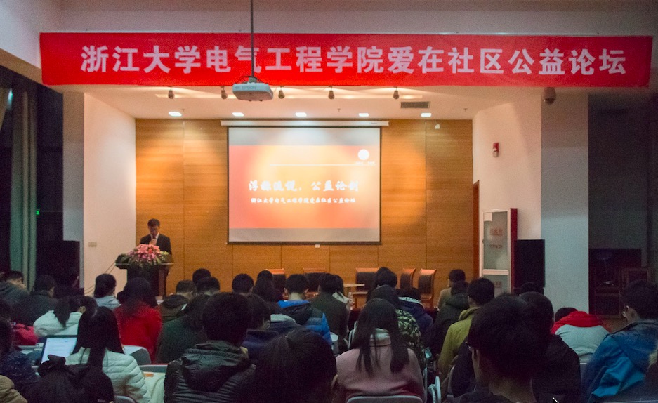 2016年12月6日18:30,电气工程学院在紫金港安中多功能厅举办爱在社区公益论坛。出席此次论坛的嘉宾有滴水公益会长周伟先生、紫金港社区书记胡利明女士、电气工程学院党委副书记陈敏老师、电气工程学院团委书记卢俏老师以及E志者协会、爱心社和雏鹰协会的代表。