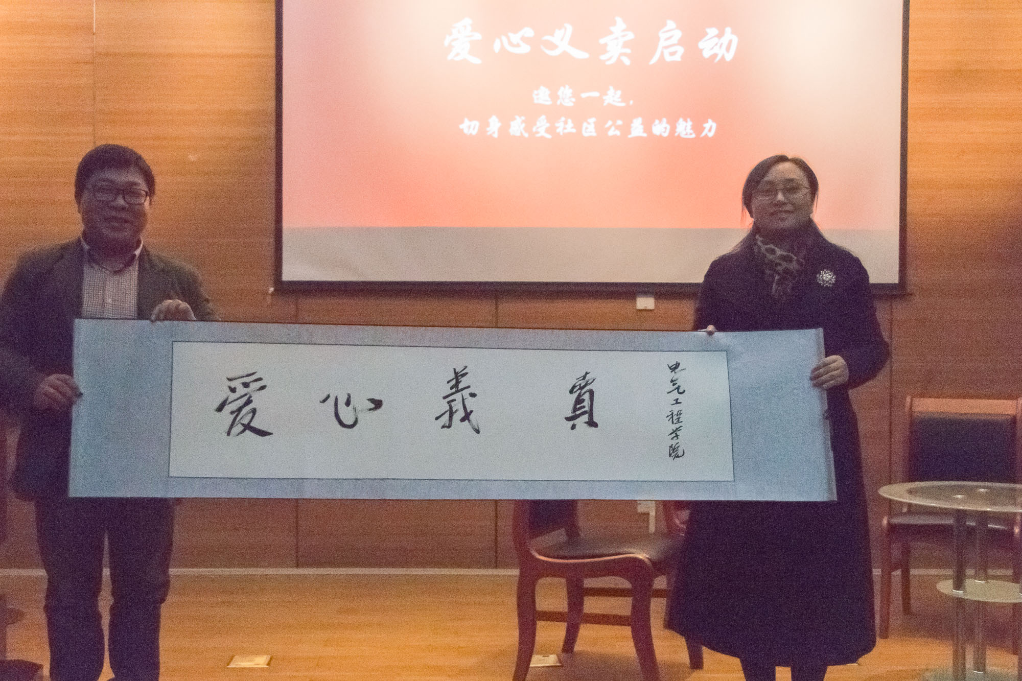 一番热烈的讨论过后,陈敏老师与周伟会长共同上台展开爱心义卖卷轴,宣布爱心义卖活动启动。