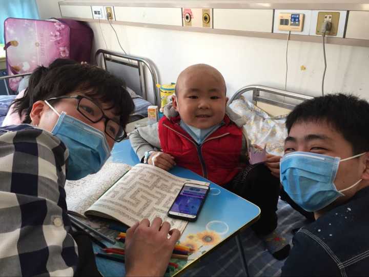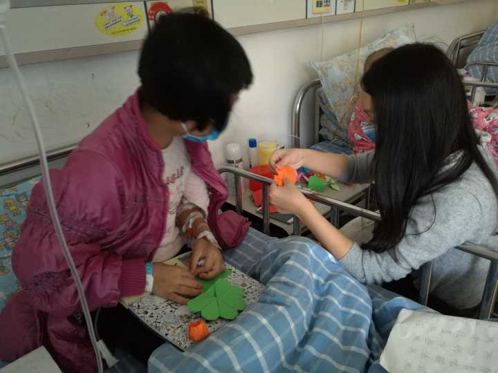下午2:00左右,我们到达了住院部五楼,在与住院部的姚敏老师沟通并登记后,仔细、耐心完成了用专用的洗手液洗手、戴口罩等措施,防止病菌传染给小朋友们。准备就绪,志愿者们分成了几个小组,分别走进了几个患有白血病的小朋友们的病房。他们年龄小的只有3岁,大的有11岁,但是他们都因为病魔的缘故必须每天从早到晚输液、住院修养,病情严重的孩子甚至要隔离在抗菌罩中。在护士的带领下,我们走到了几名病情较为和缓的小朋友身边,陪伴他们度过了这愉快的下午时光。