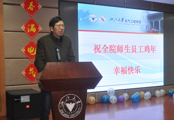 党委书记王瑞飞代表学院党政领导班子恭祝各位老师新春快乐、万事如意,向与会教师通报了学院领导班子民主生活会情况,鼓励各位老师利用浙江大学工程师学院以及绿色电网先进技术示范园区建设的契机,争大项目、建大平台、组大团队,同时动员各位老师群策群力,为学校120周年校庆贡献力量。最后,王书记提醒各位老师在即将到来的寒假中特别关注安全稳定工作,共同营造和谐大局。