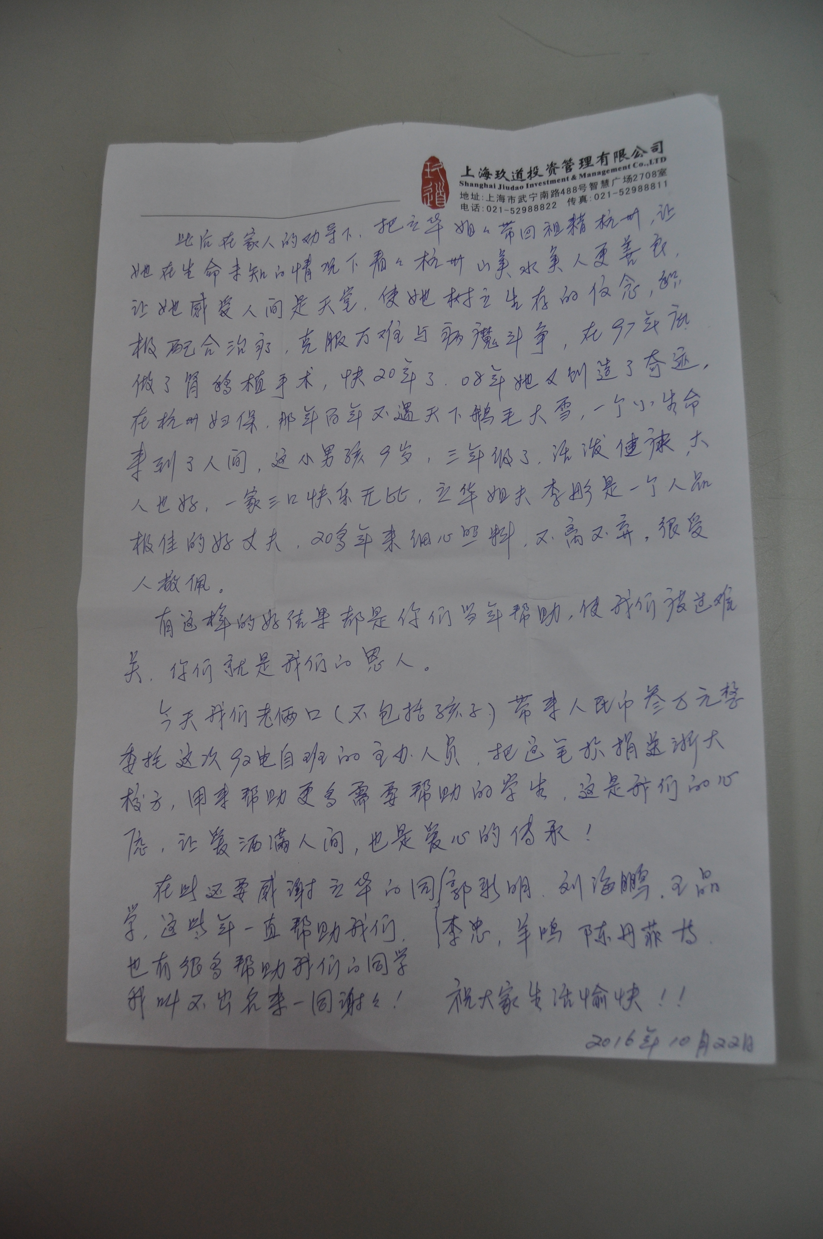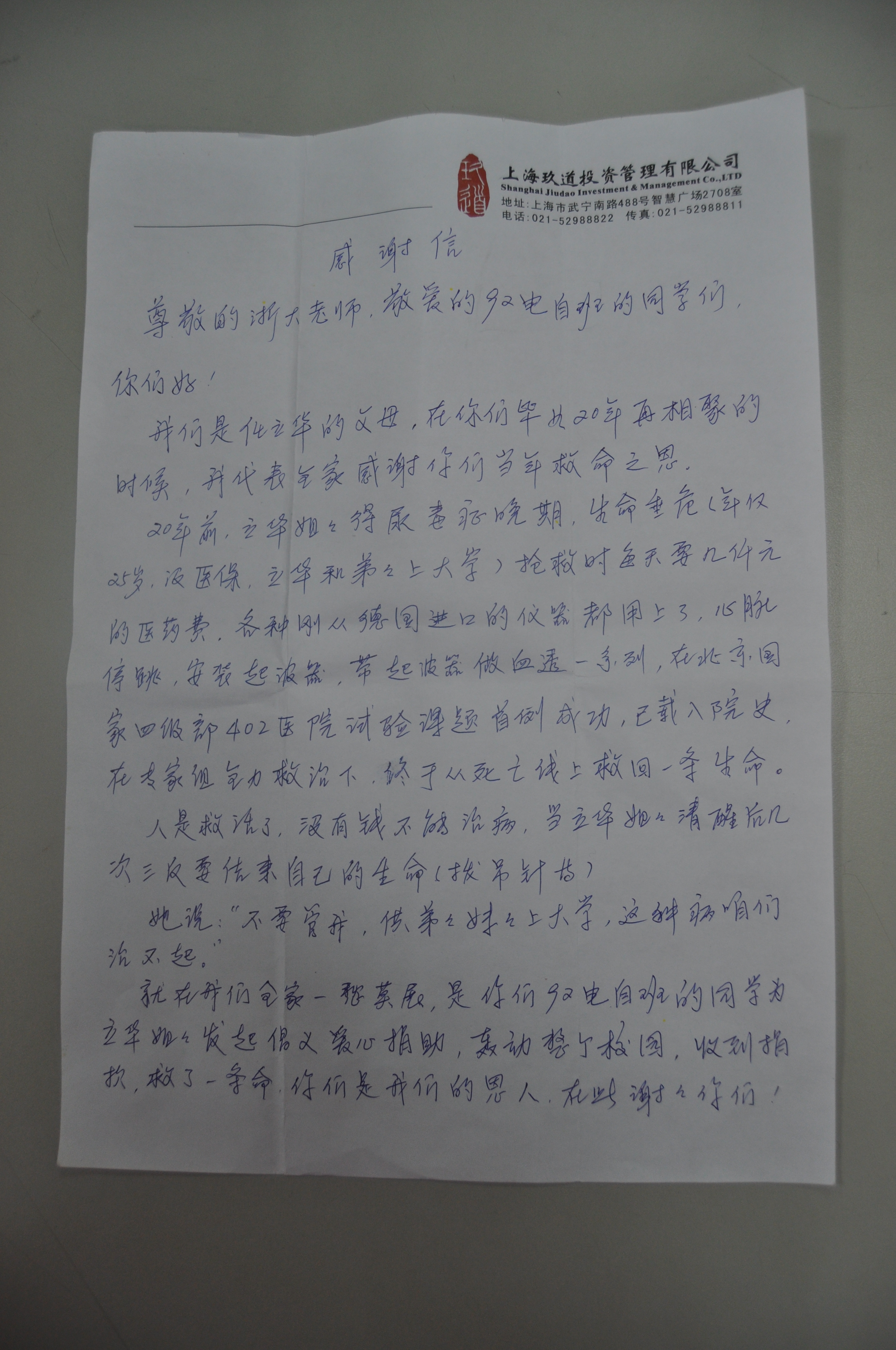 2016年,电自92级校友毕业20周年返校团聚,任立华的父母怀揣着这封饱含深情的感谢信和积攒的三万元现金来到了现场,他们说要把这笔钱捐给浙江大学,捐给有需要的同学,让爱洒满人间,让那些遭受命运无情打击的同学坚信无疆的大爱,坚信生命的力量。参加返校聚会的校友深受感染,当即决定将此次组织聚会剩余的经费9.5万元连同立华父母的捐款一起捐给浙江大学,将爱心传递下去。