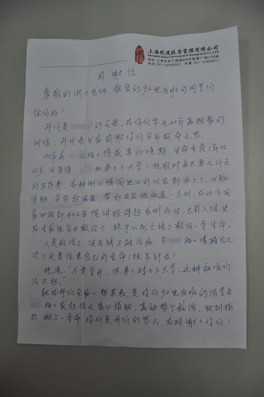 【编者按】:这是一封浙江大学电气工程学院92级校友的父母致92级电自班同学的感谢信。根据该校友的要求,隐去文中相关人员姓名。