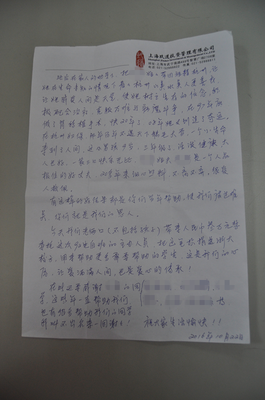 2016年,电自92级校友毕业20周年返校团聚,XXX校友的父母怀揣着这封饱含深情的感谢信和积攒的三万元现金来到了现场,他们说要把这笔钱捐给浙江大学,捐给有需要的同学,让爱洒满人间,让那些遭受命运无情打击的同学坚信无疆的大爱,坚信生命的力量。参加返校聚会的校友深受感染,当即决定将此次组织聚会剩余的经费9.5万元连同XXX校友的父母捐款一起捐给浙江大学,将爱心传递下去。