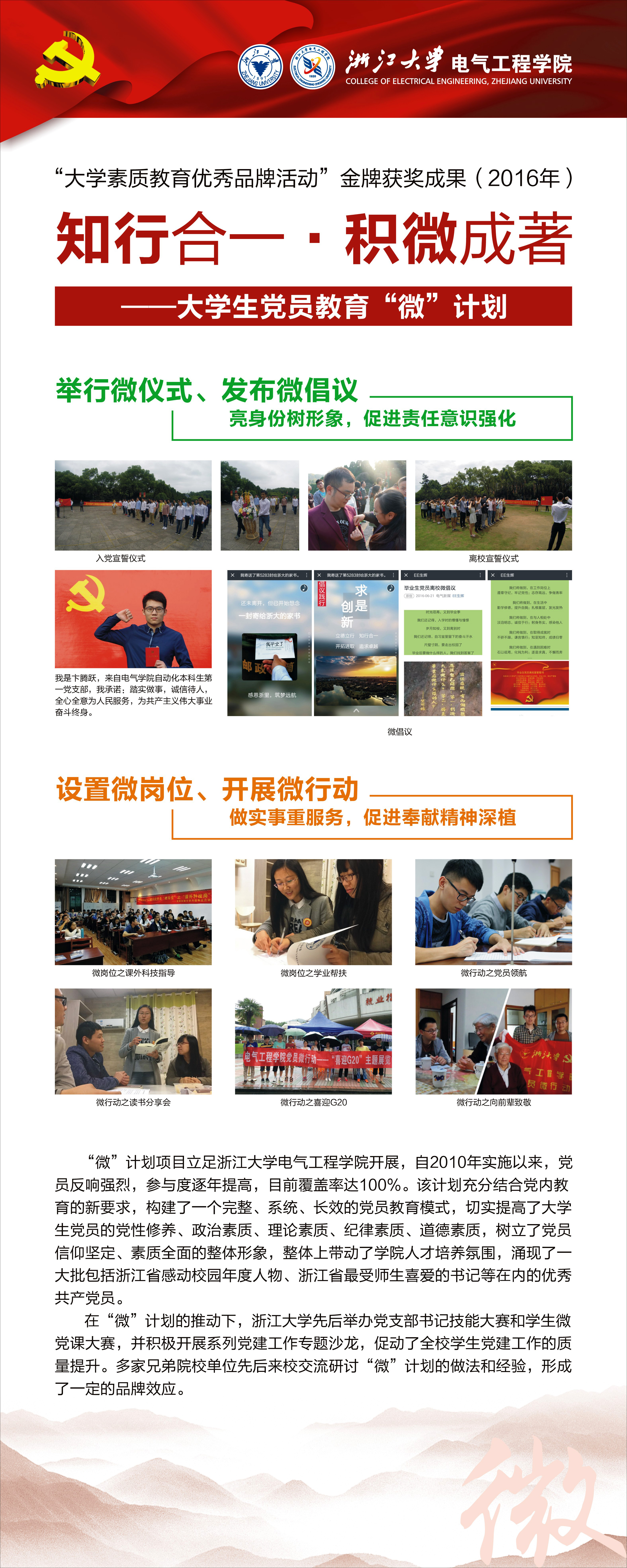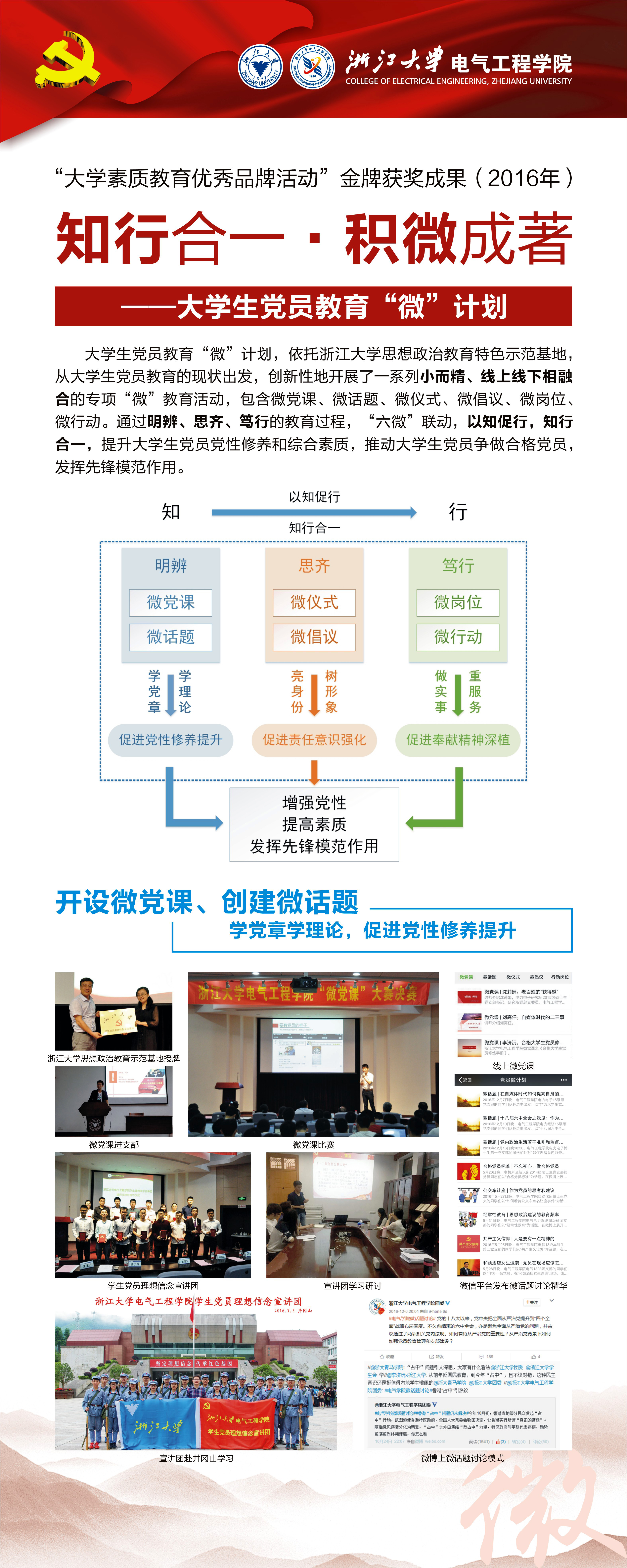 大学生党员教育“微”计划,依托浙江大学思想政治教育特色示范基地,从大学生党员教育的现状出发,创新性地开展了一系列小而精、线上线下相融合的专项“微”教育活动,包含微党课、微话题、微仪式、微倡议、微岗位、微行动。通过明辨、思齐、笃行的教育过程,“六微”联动,以知促行,知行合一,提升大学生党员党性修养和综合素质,推动大学生党员争做合格党员,发挥先锋模范作用。