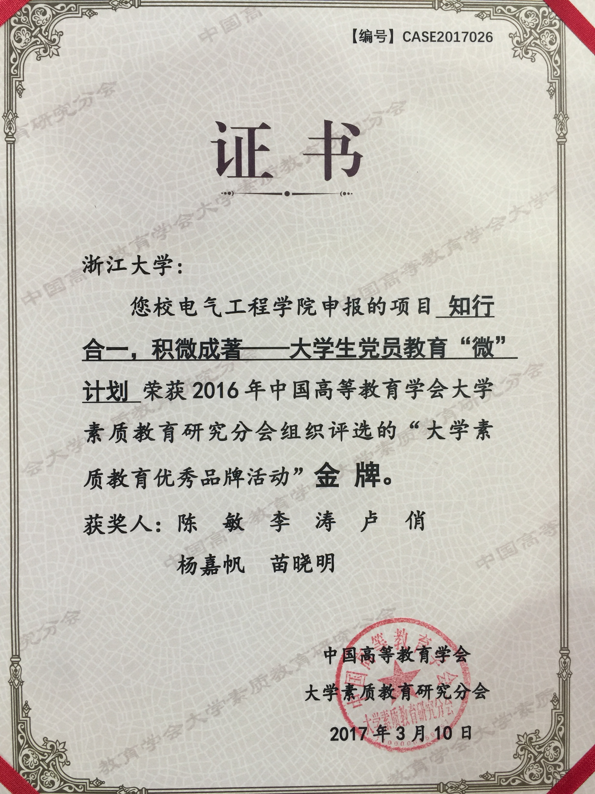 3月10日,中国高等教育学会大学素质教育研究会分会2017年会暨第六届大学素质教育高层论坛在南京农业大学举行。会上对2016年“大学素质教育优秀品牌活动”获奖项目进行了表彰,电气工程学院申报的“知行合一,积微成著——大学生党员教育微计划”荣获金牌,这是中国高等教育学会对我院素质教育工作的肯定和鼓励。