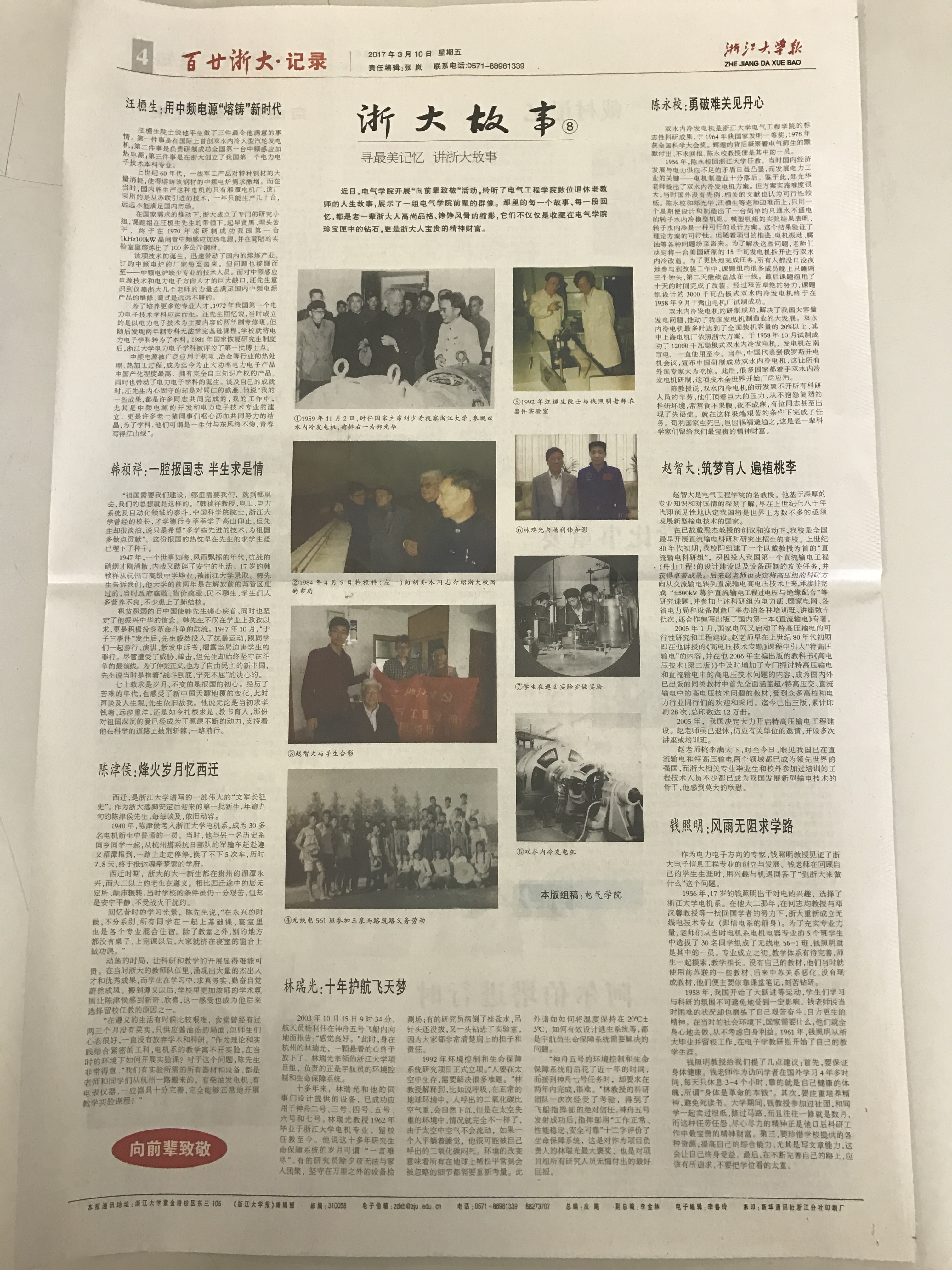 2017年3月10日,《浙江大学报》第625期报纸第4版以“寻最美记忆 讲浙大故事”为题全版报道了浙江大学电气工程学院“向前辈致敬”系列展览。