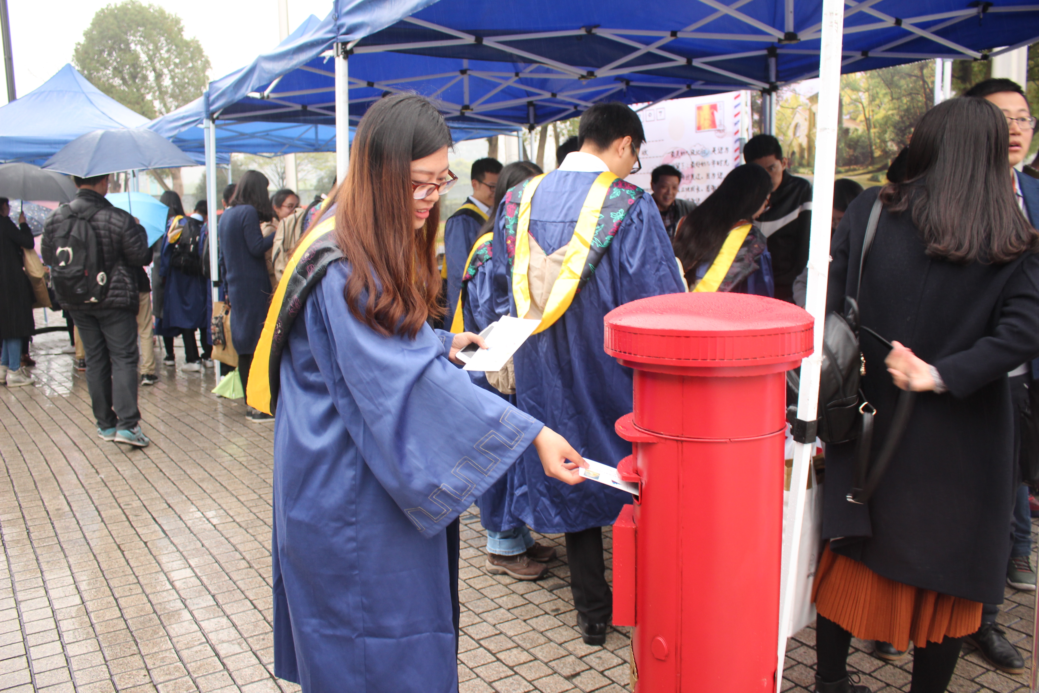 “小镇邮局”,邮寄祝福知感恩。面对一方小小的明信片,毕业生们或是低头伏案沉思,或是仰望天空遐想,在临别之前写下自己对母校、亲友、师长、同窗的祝福和感恩,在盖上纪念印章、贴上邮票、投掷到邮箱那一瞬间,他们的心也紧紧地和母校连在了一起。
