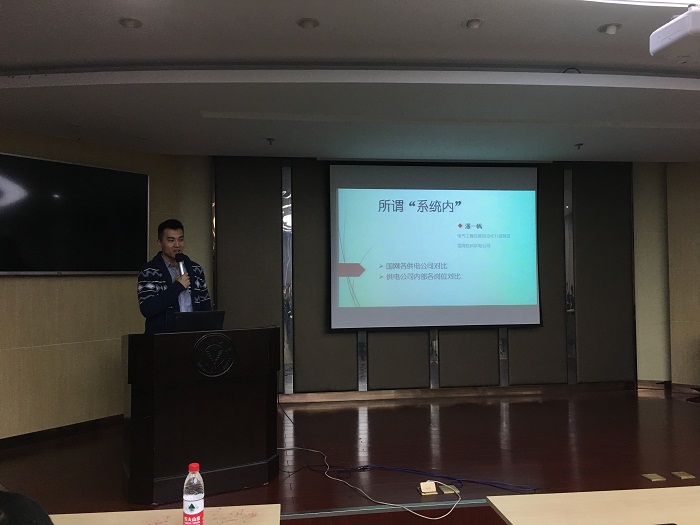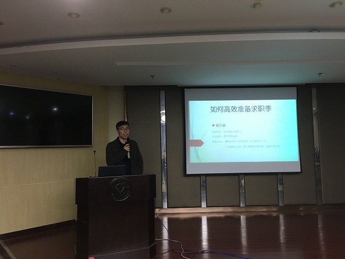 然后出场的是电力系统14级硕士侯方迪,他详细讲述了自己在GE市场部实习的经历,分享了他接触到的许多全新事物。侯方迪说实习帮助他从市场的角度全面了解整个电力行业的情况,对自己求职道路的选择有了更为清晰的认识。侯方迪结合自己求职面试的规划安排,详细介绍了各电网单位面试招聘的需要重点关注的方面,强调同学们要早决定好自己的就业方向,选择有意向的企业全身心投入准备,从而有针对性、更高效地为求职做准备。