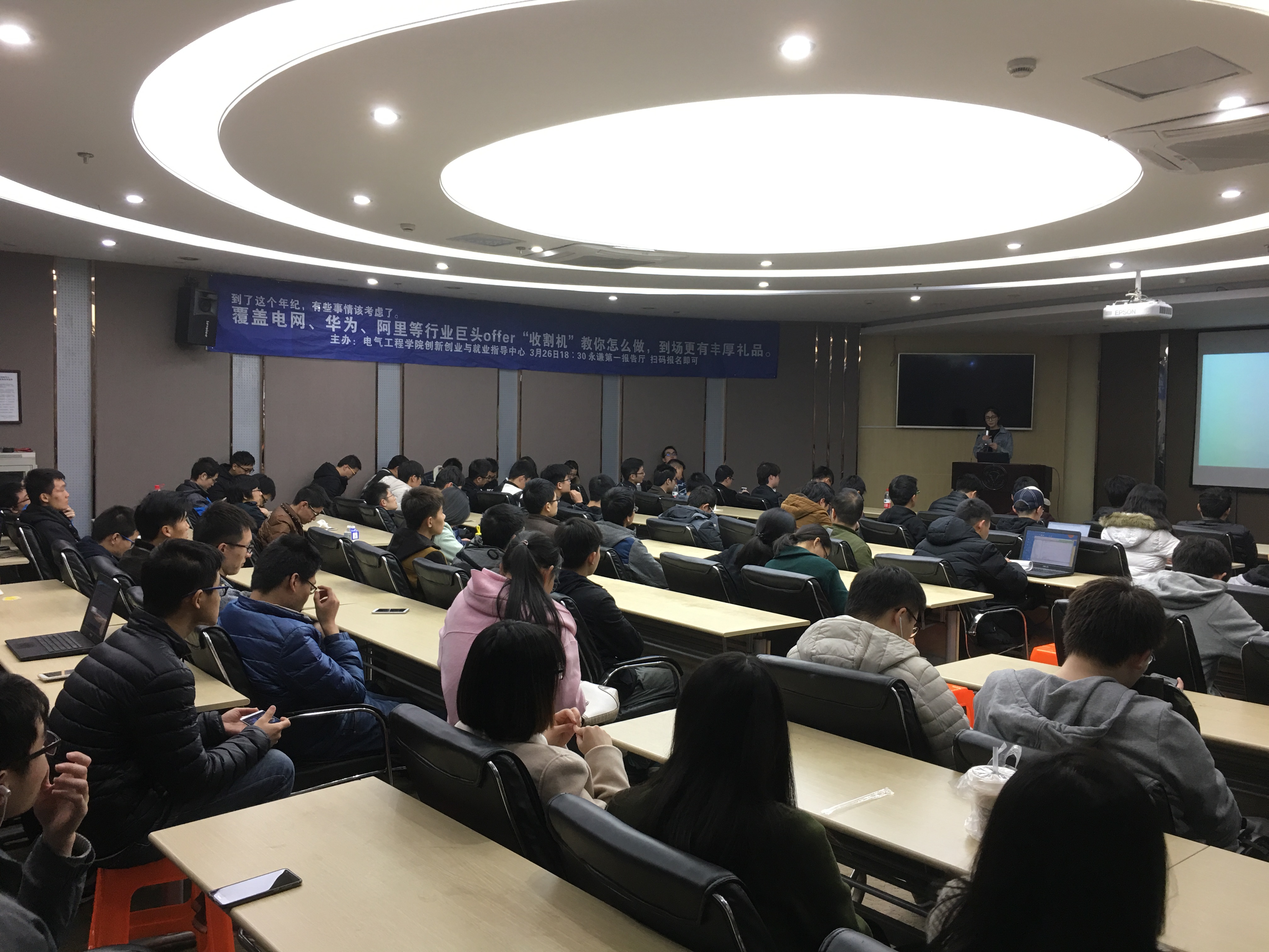 2017年3月26日晚上六点半,由电气学院创新创业与就业指导中心组织的求职分享会在永谦剧场第一报告厅拉开了序幕。本次分享会针对电气学子,面向全校的研究生和本科生开展,会上邀请了5位不同专业方向和就业类型的校友及毕业班学生作为嘉宾,从他们自身的求职经历出发与到场同学讲述自己的求职经历与感悟,将宝贵的经验分享给大家。此次活动不仅吸引了众多电气学子,也有很多其他学院的学生前来聆听,现场座无虚席。