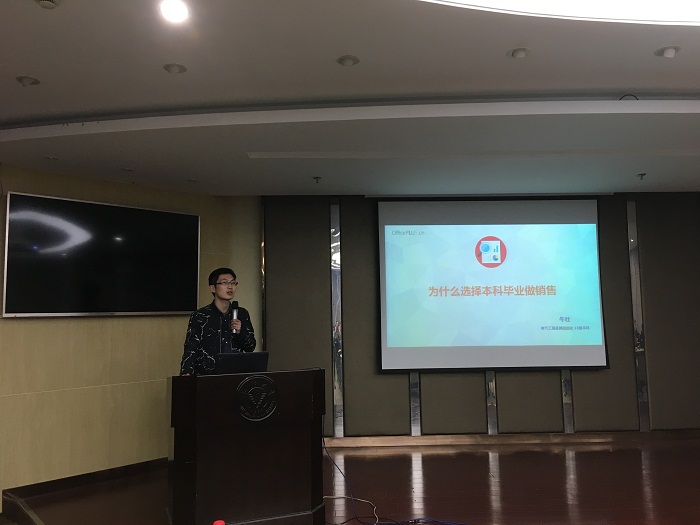 接下来是本科电气13级的牛壮同学分享了自己求职的心路历程,牛壮同学签约华为销售岗位,曾参加华为销售精英挑战赛获得优异成绩。牛壮引用一些生动有趣的故事来形象解读销售岗位的工作内容,并结合自己丰富的学习和实习经历,向同学们呈现了一个积极正面的销售形象,让大家对销售岗位有了更加深刻的认识。他还特别热心地分享自己在应聘销售岗位时制作简历以及面试的小技巧,现场同学感到受益匪浅。