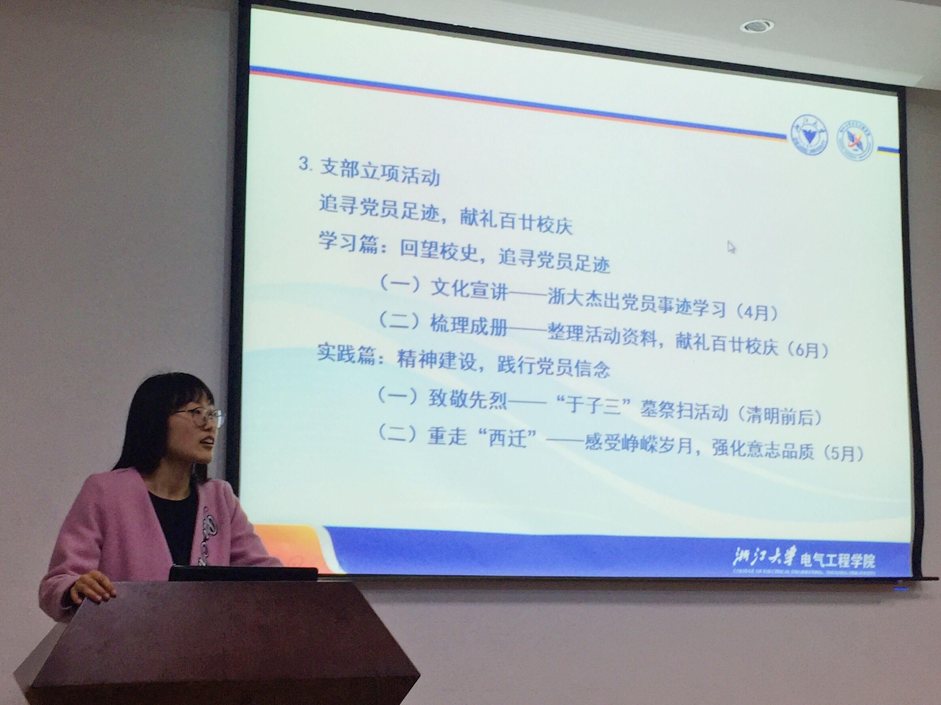 两学一做,关键在做。王惠如书记,向支部成员们介绍了本次支部立项活动的相关内容。本次立项活动以“追寻党员足迹·献礼百廿校庆”为主题分为学习篇与实践篇,划分为四项子活动,旨在通过学习优秀党员事迹,践行党员精神,深化同学们的党员意识,将党员精神践行到实践中去。
