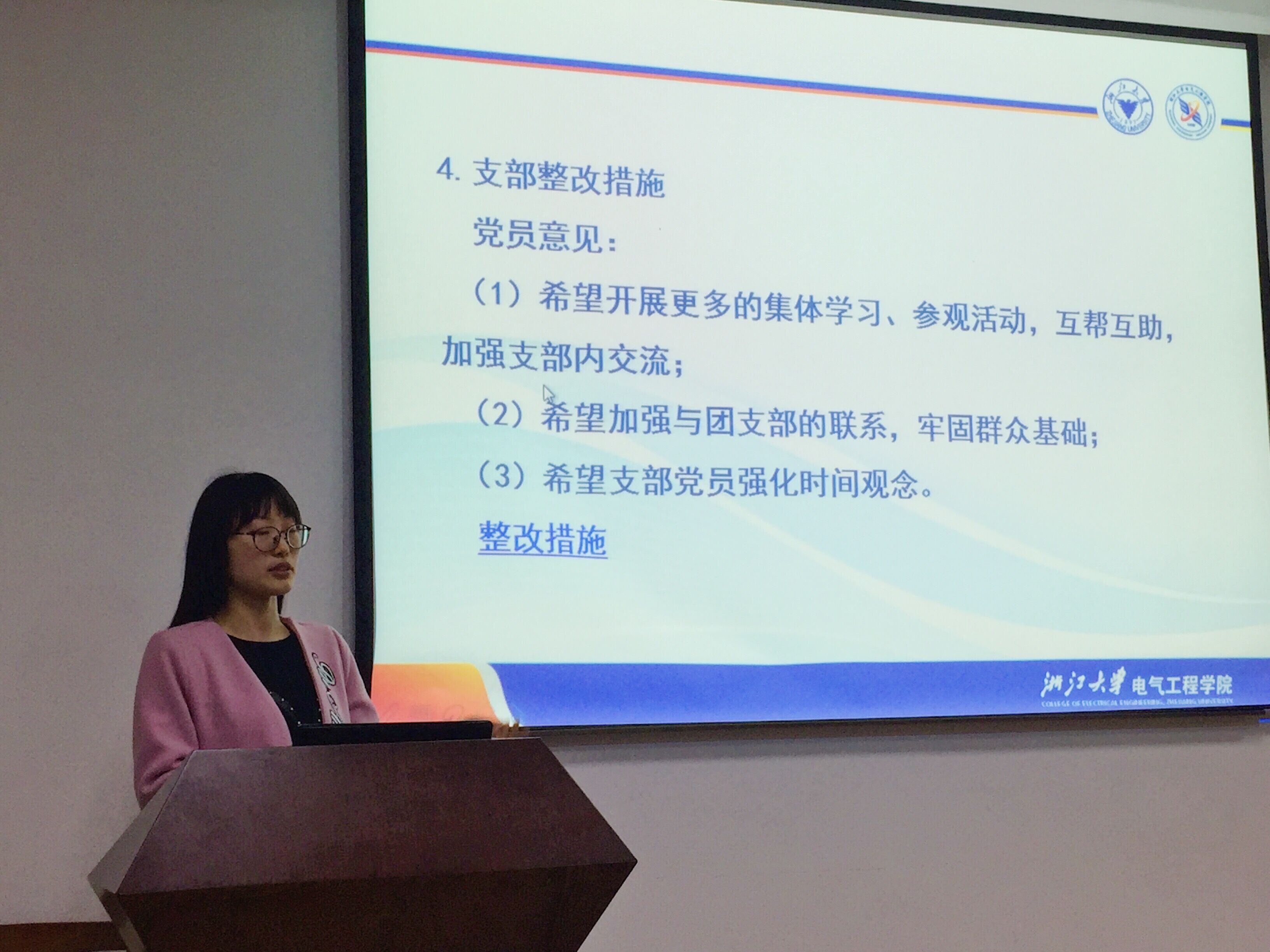 会上,王惠如书记宣读了支部整改措施,并向与会的党支部成员征求了修改意见。与会的党支部成员一致同意并通过了支部整改措施,相信经过大家的共同努力,我们的电气工程及其自动化本科生第一党支部一定会建设的越来越好。