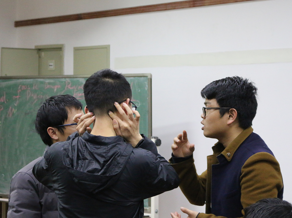 主讲人陈医师从中医角度介绍颈椎疾病基本知识后,还向同学们演示了常用的颈椎推拿手法和几个关键的穴位。活动中,中医药大学的研究生们也纷纷加入到现场互动中,把活动气氛推向了高潮。