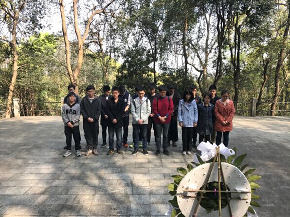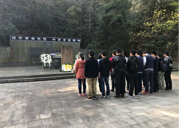 于子三烈士墓便坐落在这风景秀丽的万松书院中。万松书院是一所始建于明代的书院,袁枚等大家均在此就读,还是著名的民间故事“梁山伯与祝英台”的发生地。把于子三烈士墓放在这样的书院中想必与于子三烈士虽未一介书生,却未敢忘忧国的精神有关。在对书院进行简单的参观后,同学们来到了于子三烈士的墓前。但见葱郁的树木环抱着广场,朴素却庄重的于子三墓坐于广场之中。“学生魂”三个遒劲有力的大字赫然题于墙上。墓前已经摆满了来自浙江大学各方面及其他群众祭奠于子三英魂的花圈。同学们首先阅读了刻画在墙上的英烈事迹,无不为于子三英雄的事迹所感动与激励。于子三烈士作为一名浙江大学的学生,在求是精神的指导下,在那个动荡的年代里敢于担当大任,转移国运,不惜献出自己的生命。随后,党支部书记张朱浩伯学长发表了简短讲话,号召在场同学铭记于子三前辈的革命精神,勇于奋斗、不断前进。之后,在场同学一同为于子三烈士默哀了三分钟。