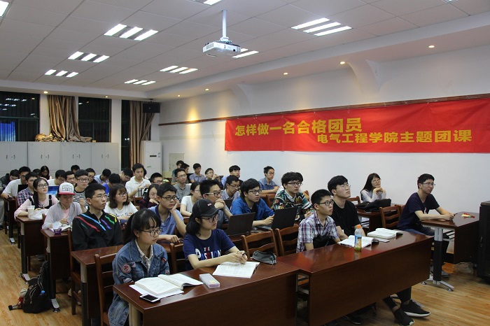 2017年4月16日18:30,电气工程学院在教二121举办了以“怎样做一名合格团员”为主题的团课。电气1401、电气1405和电信1403共61名同学参加了此次团课。团课邀请了电气工程学院第九届十佳学子代表廖伟涵同学和严铭同学作为主讲人,团课由团委书记助理王惠如主持。
