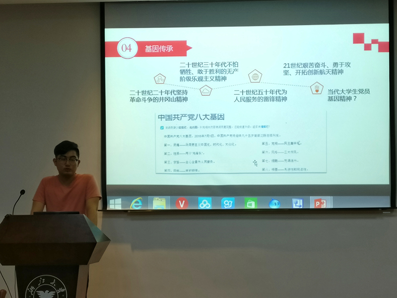 孙翀同学以“传承与践行共产党员红色基因”为主题展开演讲,他带领大家回顾了我党的优秀基因,从20世纪20年代坚持革命斗争的井冈山精神,到30年代不怕牺牲、敢于胜利的无产阶级乐观主义精神,再到50年代为人民服务的雷锋精神,最后到21世纪艰苦奋斗、勇于攻坚、开拓创新的航天精神,这些优秀基因需要当代大学生党员继续传承与践行。他同时也对目前部分大学生党员中存在的不良现象提出批评,并认为大学生表达优秀“红色基因”可从坚定理想信念、争做模范先锋、全心全意为人民服务等多方面做起。