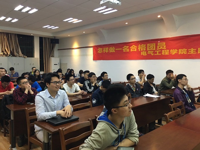 2017年4月26日18:30,电气工程学院在教二121举办了以“怎样做一名合格团员“为主题的第二次统一团课。电信1301、电信1303等支部共45名同学参加了此次团课。团课邀请了电气工程学院第九届十佳学子代表王霄鹤和第七届十佳学子代表李媛作为主讲人,团课由团委书记助理王惠如主持。
