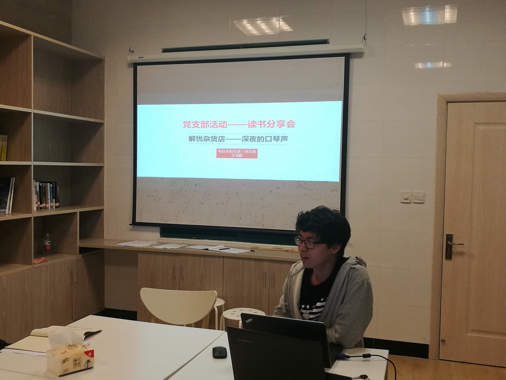 这次党支部活动是由党支部书记詹焕友同学主持。他首先介绍了党支部近段时间的工作安排,策划好了今后党支部的工作进展,然后说明了一下这次活动的目的以及期望,其后读书分享会活动正式开始。从党支部书记开始,每个同学都介绍了各自读过的一些书以及自己的一些深刻感悟,其中有些同学分享了小说如梁志坚同学的《狼图腾》,王泽峰同学的《解忧杂货铺》,江海天同学的《北京折叠》,有些同学分享了散文如詹焕友同学的《当我谈跑步时我谈些什么》,李雨岑同学的《目送》,还有同学分享了政治论文如吴汉同学的《中国自信》等,引发了同学们广泛的思考和讨论。