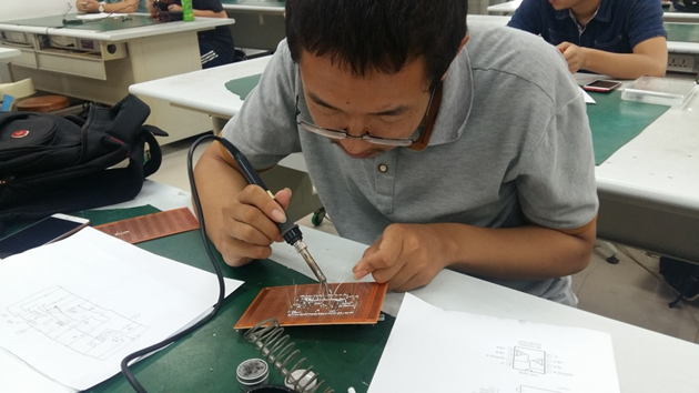 为了让缺乏焊接经历的同学充分了解焊接技术,6月9日下午,我们邀请了E志者协会蒋柯越同学向大家详细介绍了电路板焊接的要点和技巧,并焊接了一个简单的LED电路作为训练。同学们对电路板焊接的热情也被调动起来。随后,我们进行了趣味焊接,趣味焊接题目是一个调速闪烁灯电路,虽然原理简单,但对于低年级和非工科专业的同学们来说也具有一定的挑战性。许多同学由于以前缺乏焊接经历,显得小心翼翼,操作并不熟练,但在我们工作人员的指导与帮助下,伴随着或快或慢地闪烁着的灯光,参与的同学还是全部完成了电路的焊接。