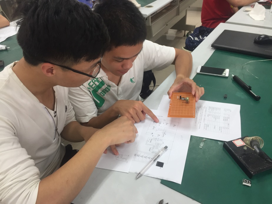 在宣布比赛正式开始后,我们发放了比赛题目、焊接设备及元件后,同学们迅速进入了状态。大家或伏案画着电路图,或用剪刀认真地分割着导线,或拿着电烙铁专注地焊接。对照原理图,讨论焊接步骤,熟悉元件,对元件定位。队员之间配合默契。现场气氛紧张而热烈。
