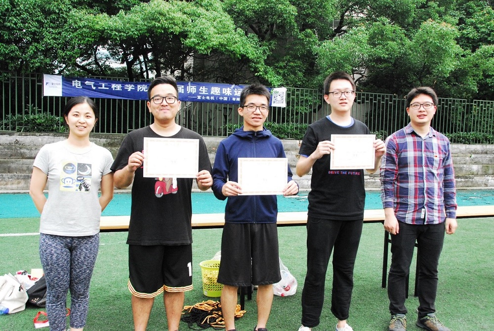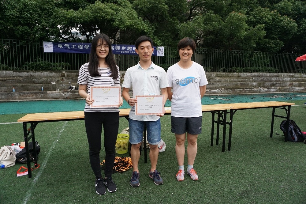 激烈而有趣的正式比赛结束后,工作人员统计了每一支参赛队伍的得分和排名,最终,“EMD大家庭”(队长:赖林迎前)、 “HVDC & FACTS group”(队长:肖亮)和“地表最强”(队长:赖佳俊)队伍获得了三等奖,“307大壮相亲后援团”(队长:陈民权)和本场的唯一一支本科生队“两千块队”(队长:陈同有)获得了二等奖,而“AEMC实验室”(队长:王远喆)则摘得了本次趣味运动会的桂冠,拿到了一等奖和金灿灿的奖杯。吴立建老师、黄晓艳老师、卢俏老师和李涛老师分别为获得一、二、三等奖的队伍颁奖。同时,其余队伍也都在一些单项上获得了不错的成绩。