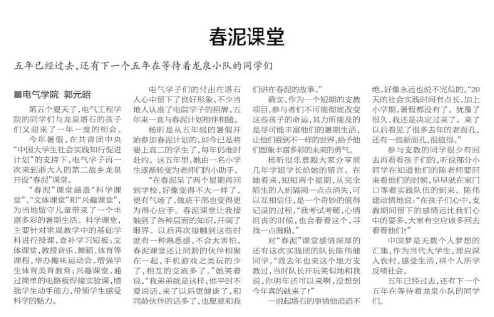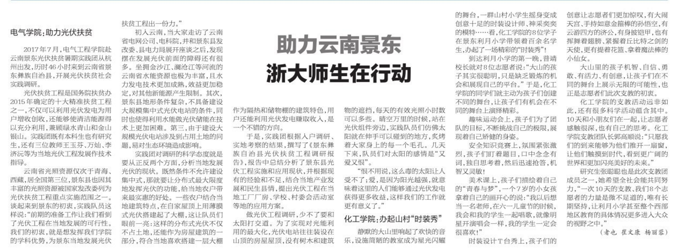 今日,《浙江大学报》第三版、第四版分别报道我院赴云南景东“光伏扶贫”以及赴浙江龙泉“春泥课堂”支教社会实践活动,引起较好反响。