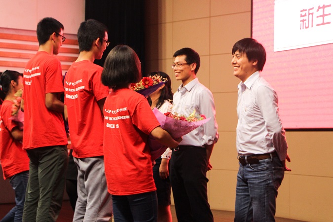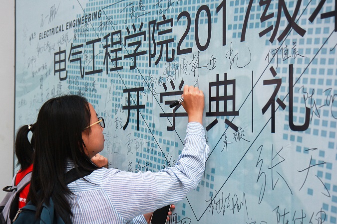 临水报告厅外,17级本科新生们在签名墙上写下姓名留念。临水报告厅内,一段精彩的暖场街采视频后,新生开学典礼正式开始。奏唱国歌后,一段精彩沙画视频带领大家回溯了电气工程学院悠久而辉煌的历史,近百年的办学历程沉淀的是电气人对“求是创新”校训的坚守和初心。
