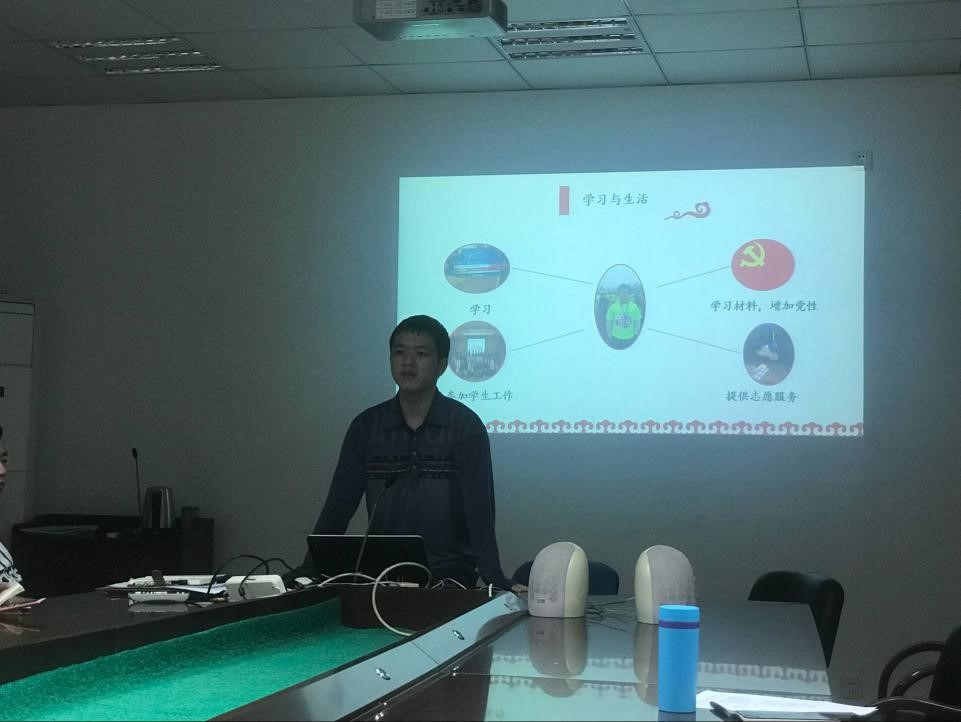 首先进行的是接收优秀团员答辩。由严庆鑫等同志上台答辩,每人进行五分钟的PPT展示,讲述他们的入党动机,社会工作情况,学习情况等,同时,他们也指出了现在自身存在的不足以及未来将要改正的地方,经过表决,正式党员一致同意接收以上七名同志为积极分子。