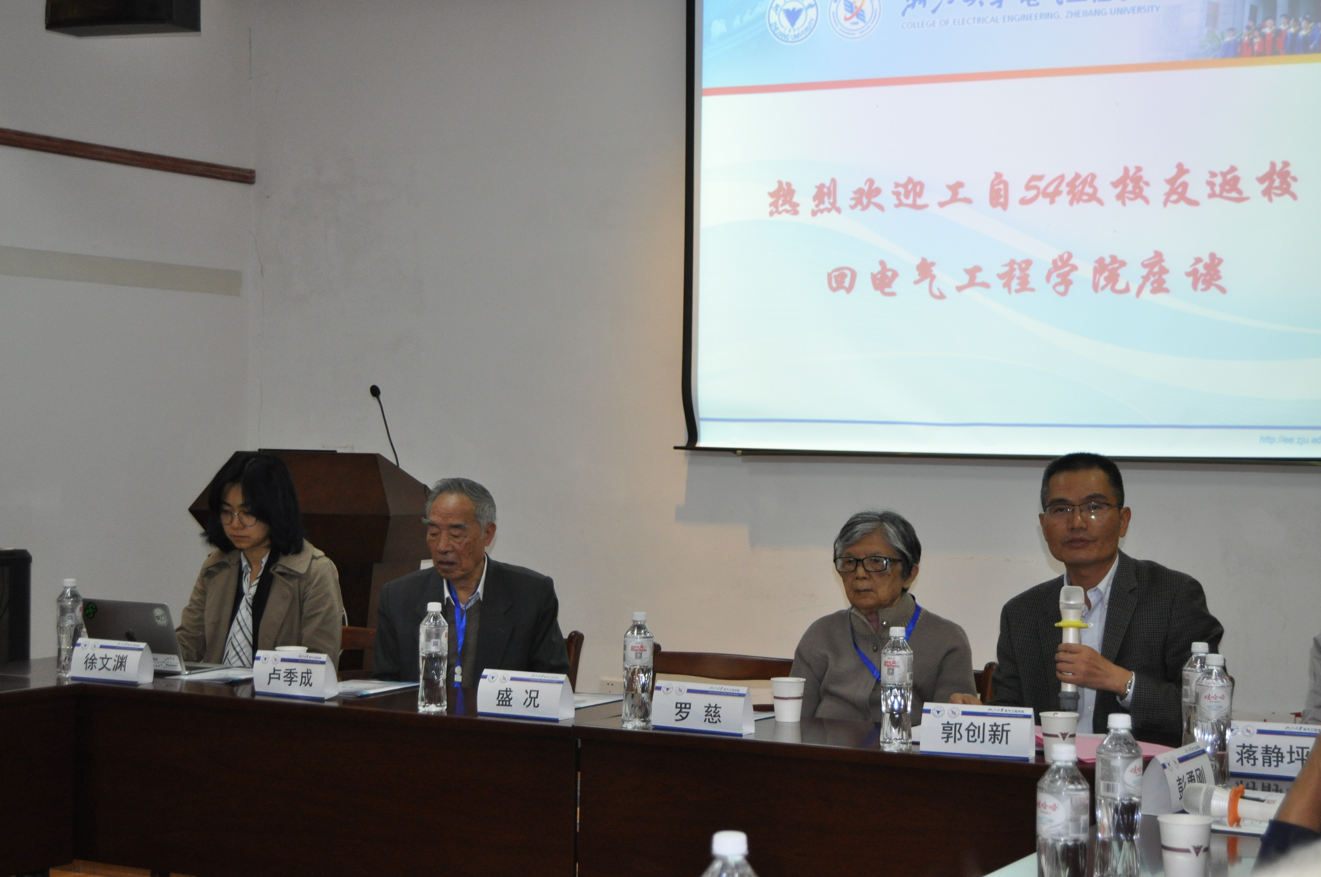 上午,校友们共聚玉泉校区第二教学楼121室,举行座谈会。电气学院党委副书记郭创新热情欢迎校友“回家”,并向校友们简要介绍了学院人才培养、师资队伍建设、学科布局、科学研究等各项工作的情况。郭书记表示,学院发展的背后凝聚了全院师生的拳拳之心,更凝聚了广大校友惠教泽学的爱心。工自54级校友罗慈曾多次向浙江大学捐款,用于王国松教育基金、赛霸奖学金、控制科学奖学金等,2013年9月,罗慈、林文震伉俪更是高额捐赠250万元,至今罗慈女士的累计捐款额已达400余万元,设立的电气工程学院平安基金、罗慈-林文震奖学金已惠泽了学院的广大师生。郭书记对各位校友的慷慨捐赠表示衷心的感谢,也竭诚希望广大校友能够一如既往地支持学院发展。