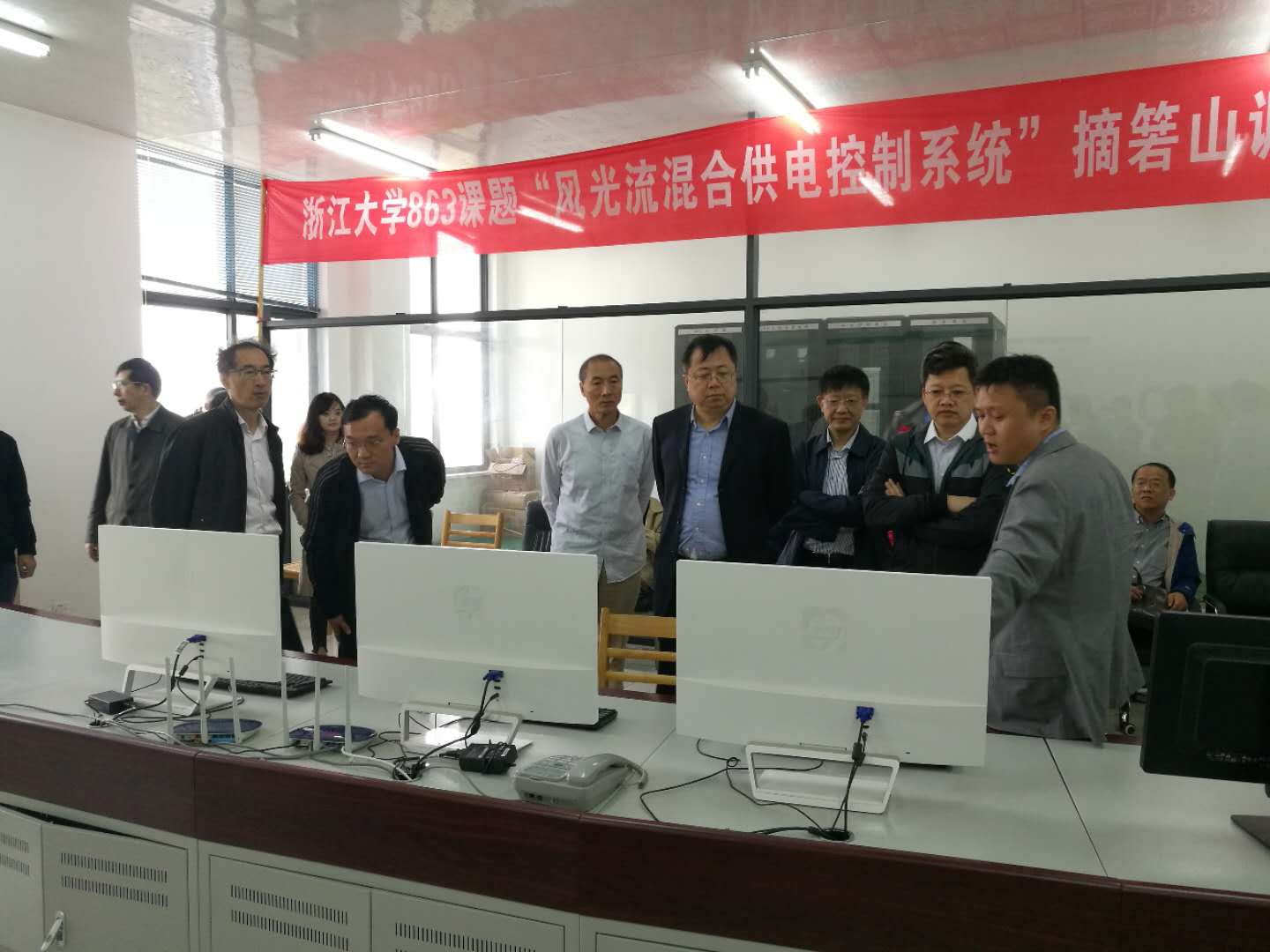 项目验收专家和科技部领导首先乘坐浙江大学紫金港号赴浙江舟山摘箬山岛示范点进行现场考察。项目首席专家韦巍教授给专家介绍了示范工程的建设情况。辛焕海教授给各位专家介绍了海岛新能源供电系统多模式运行及无缝切换等功能。