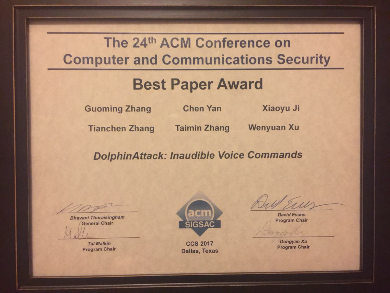 来自浙江大学电气工程学院徐文渊教授团队(USSLAB)的论文Dolphin Attack:Inaudible Voice Commands经过层层选拔,从840多篇论文中脱颖而出,被ACM CCS 2017录用。值得一提的是,包括来自麻省理工大学、加州大学伯克利分校、马里兰大学等11篇论文被提名(占总投稿的1.3%, 11/846),而Dolphin Attack: Inaudible Voice Commands经过为期6周、3轮组委会的严格投票,最终荣膺最佳论文奖(5/846)。这是国内高校和研究机构首次获得该会议的最佳论文奖,是中国研究人员在国际网络及信息安全领域的一次重要突破。