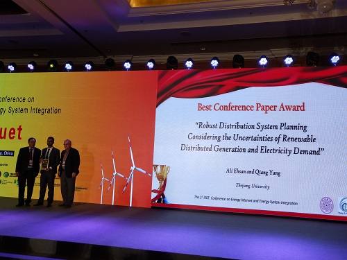 电气工程学院杨强副教授论文“Robust Distribution System Planning considering the Uncertainties of Renewable Distributed Generation and Electricity Demand”从来自全球各地的近900篇论文中脱颖而出,获得会议最佳论文(10/900)。该研究工作由杨强副教授指导其博士研究生Ali Ehsan共同完成。本研究工作重点解决了考虑多维度不确定性条件下的高比例分布式新能源主动配网的优化规划问题,对于解决当前多类型能源集成下的分布式电源规划问题提供了一种可借鉴的解决方案。