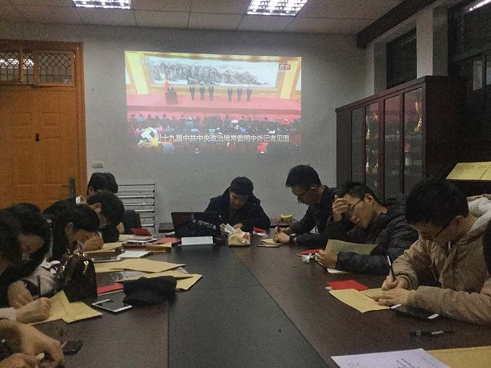 2017年11月25日14:00,电机与电器15级硕士生党支部的同学们会聚在电机楼403,开展以“立足当下,展望未来”为主题的党日活动。本次活动主要分为三个部分,首先是第一部分:重温中国共产党新一届常委媒体见面会。当新一届常委缓缓走到荧屏中央时,大家响起了热烈的掌声,以表达对新一届常委的期待。听完习近平总书记在媒体见面会上的讲话,大家由衷觉得新一届常委必然带领全党全国各族人民在实现“伟大中国梦”的路上越走越好。