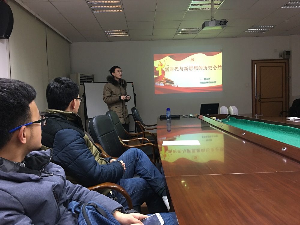 紧接着,陈光普同学为支部成员带来了“新时代与新思想的历史必然”的微党课。从1978年十一届三中全会开启的改革开放的“新时期”使中国的经济社会得到了快速发展,到中国共产党第十九次全国代表大会确立的中国特色社会主义的“新时代”,中国从怎么“富起来”变成怎么“强起来”。陈光普同学深入浅出的为我们讲解了“中国特色社会主义新时代”和“习近平新时代中国特色社会主义思想”的辩证关系,并且指出新时代和新思想的提出都是有着其历史渊源,具有理论基础,并符合时代的特点。最后他总结新时代和新思想都是一种历史必然。