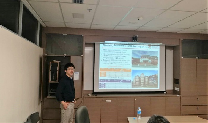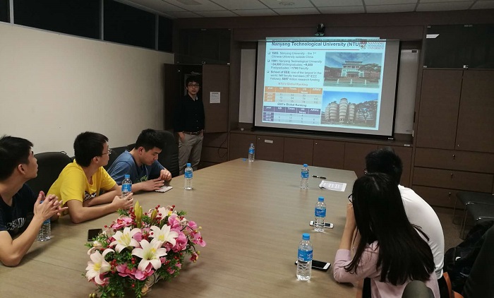 抵达南洋理工大学后,EEE(SchoolofElectrical and Electronic Engineering)的助理教授徐岩博士热情接待了访学团,并向访学团介绍了南洋理工大学的基本情况以及EEE学院的几大研究方向,幽默生动的讲解引起了热烈的讨论。随后,徐老师与访学团的同学们进行了深入的交流,对未来研究生阶段的学习规划以及科研方向给出了中肯的建议。
