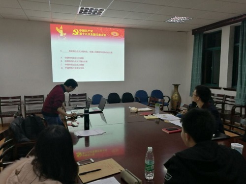 党课结束后,在冯彪同学的主持下,支部进行了以“学习贯彻党的十九大精神”为主题的知识竞赛,检查支部党员对十九大内容的熟悉程度。比赛按年级分为两组,考虑到大四部分同学考研政治学习,由大三同学优先回答,然后大四同学进行补充或纠正。题目分为选择和填空,答题结果体现出总体上同学们对十九大进行了自主学习,有一定的知识积累,但不够深入。通过此次竞赛,同学们深刻认识到自身对党的十九大精神学习的不足,需要继续加强学习。