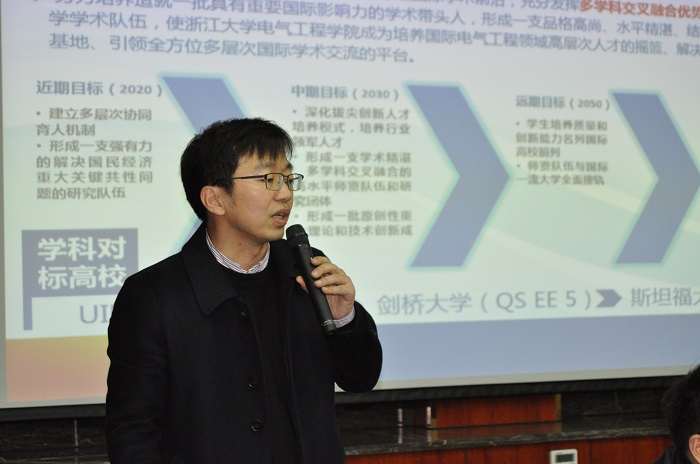 电气工程学院院长盛况围绕学院“双一流”建设实施方案作专题报告。报告涵盖“双一流”建设目标、建设思路、实施举措等,指明学院“双一流”建设围绕“党建与思政工作”、“学科方向与规划”、“师资队伍建设”“人才培养”、“科学研究”、“社会服务”、“国际交流与合作”等方面的工作目标,明确提出未来三年人才培养和学科建设的一些关键性指标、预期成效和进度安排。他指出,浙江大学电气工程学院取得过非常辉煌的成就,在新时期也面临着巨大的挑战,希望专家学者为学科建设把脉,分析存在问题,指明发展方向。