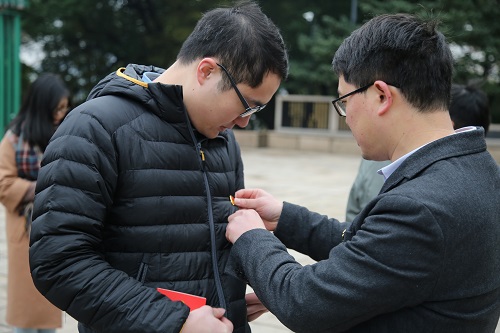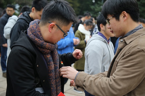 最后,李涛老师和杨嘉帆老师为新党员们佩戴党徽和发放党章,每位党员都在党旗下拍照留念,记录下自己的入党时刻。