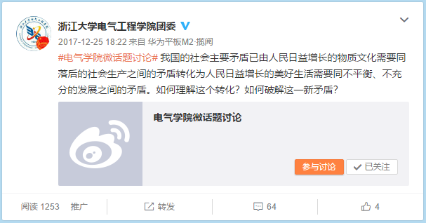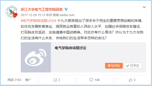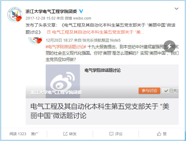 以公共微博为载体,以“微话题”内容引导广大学生党员对十九大报告及相关时事热点展开思考和讨论,既有关于对新时代、新思想理解的探讨,也有对于青年党员应当如何发挥能动性的思考,引起了全员党员同学的热烈讨论。在每个话题讨论结束过后,针对讨论过程中的精华进行总结,及时以长微博的形式发布话题总结,使未加入整个讨论过程的同学也能够学习还原的讨论精华。