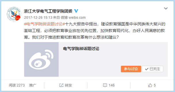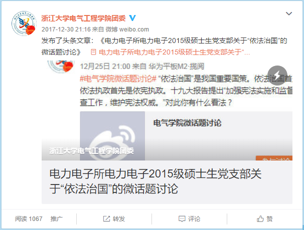 “微话题”活动是电气工程学院党员主题教育基地“微计划”的重要内容,此次“微话题”活动以十九大报告和新党章学习讨论为主题,进一步推进了学院党员深入学习、宣传、贯彻党的十九大精神,有效拓展了党员学习的时空,极大丰富了学习的内容与形式。“微话题”活动以促进学生党员的素质提升为根本目的,充分发挥党员主体作用,学生积极主动参与,党员自我与互相教育,以“小而精”的活动方式,在思维碰撞中发出浙大学子自己的声音。
